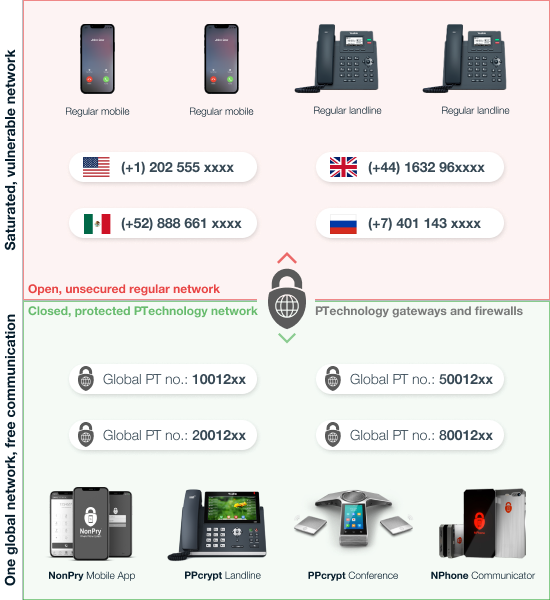 | Connection security | Protected, untappable, multi-layered channel and data encryption, including SRTP/ZRTP-TLS | PTechnology: secure until public ecosystem Regular providers: tappable + backdoors |