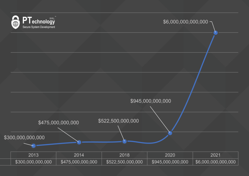 While the estimated cost of cybercrime in 2013 was $ 300 billion, estimations say in 2021, cybercrime costs approximately $6,000,000,000,000 worldwide..