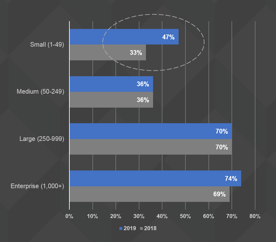 However, the biggest problem is the dramatic increase in the number of attacks on small and medium-sized businesses. For small businesses, we saw a giant leap from 2018 to 2019.